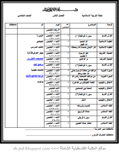 خطط فصلية في التربية الإسلامية من الصف الخامس وحتى الثاني عشر الفصل الثاني المكتبة الفلسطينية الشاملة