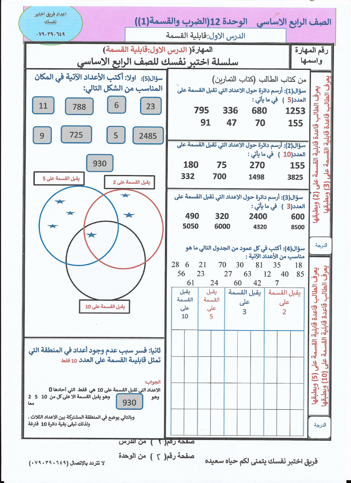 الدرس الاول قابلية القسمة سلسلة اختبر نفسك للصف الرابع الاساسي