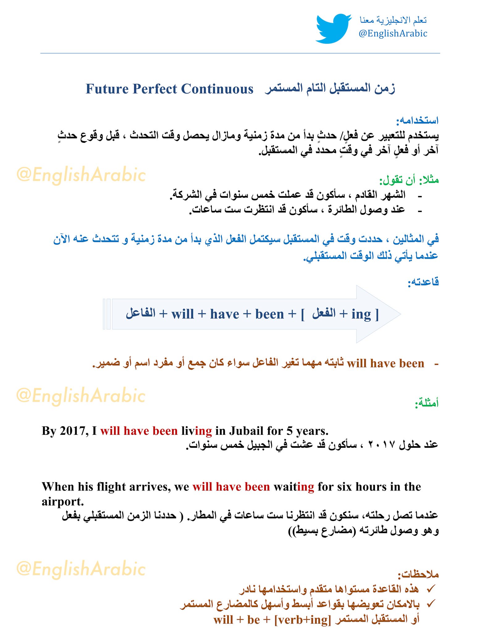تعل م الإنجليزية معنا Pa Twitter قاعدة زمن المستقبل التام المستمر Future Perfect Continuous استخدامه و قاعدته مع الأمثلة درس متقدم
