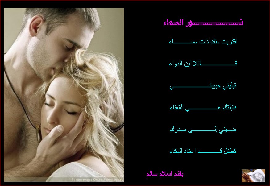 ضميني اليك يا حبيبتي و قبليني ضميني بين أضلعك ضميني فـانـآ احتـآج إليك فغذيني يـآ امرأة غيرت مفـآهيم الحب يـآ امرأة أشعلت نـآرا في القلب ضميني بين أضلعك