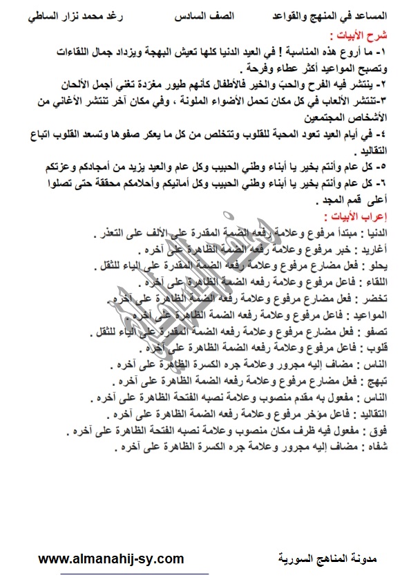 شرح قصيدة العيد في اللغة العربية للصف السادس الفصل الثاني