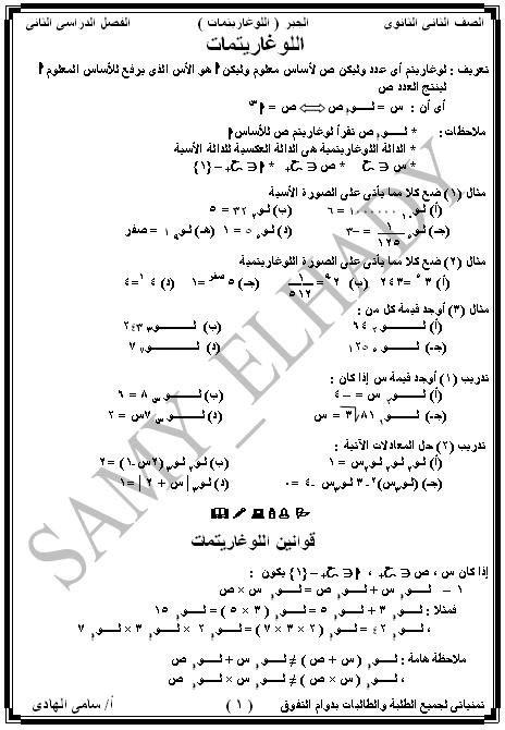 مذكرة مسائل جامدة جدا بالحل النموزجى على اللوغاريتمات والاسس للصف الثانى الثانوى الفصل الدراسى الثانى